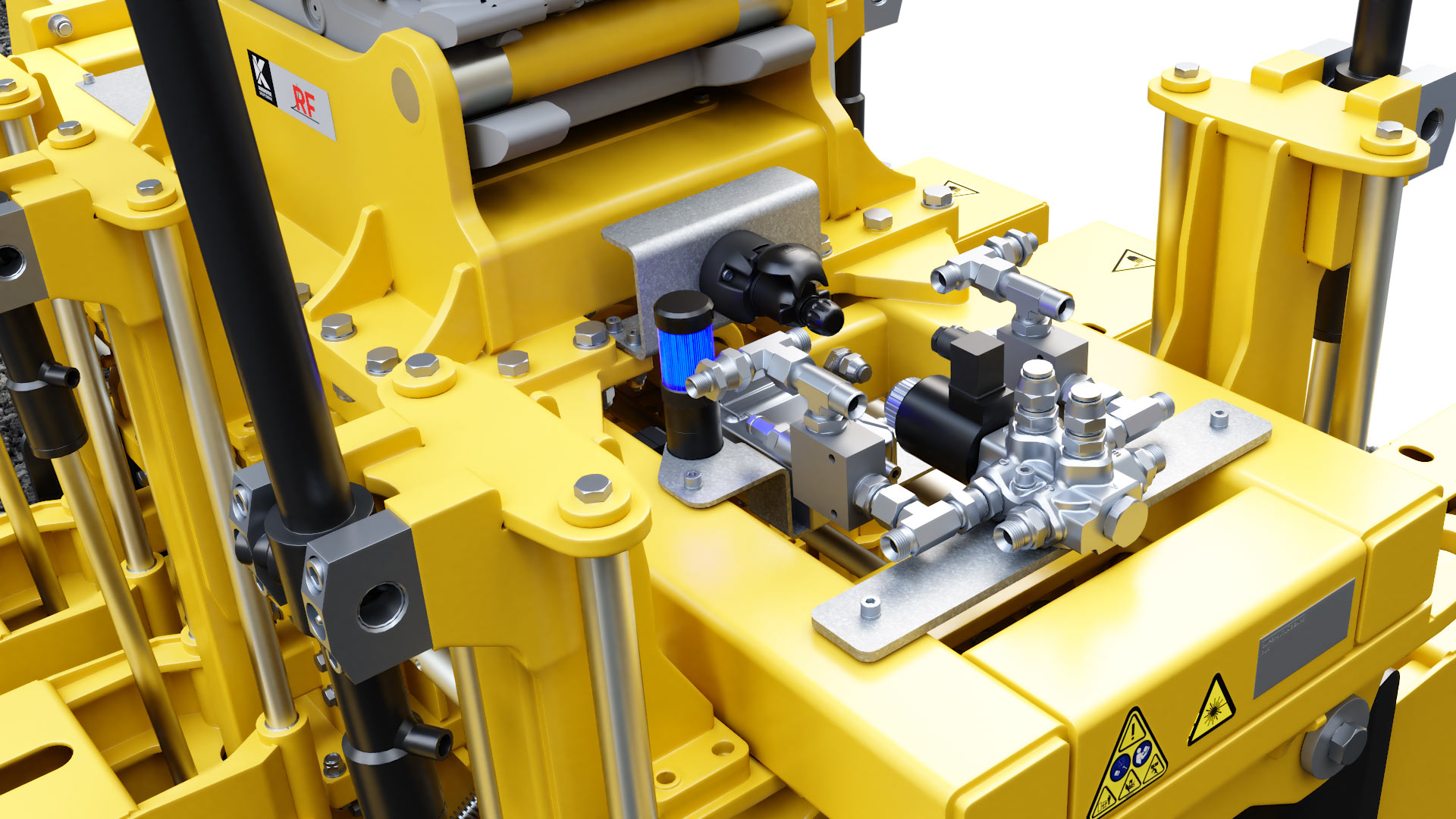 Range finder (laser) with lamp set for correct sleeper laying. Fully automatic quick coupler systems from all manufacturers.