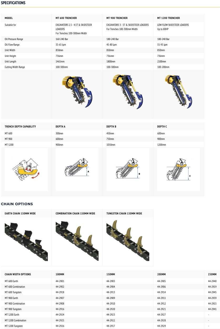 Flöde: 60-95 l/min, Tryck: 180-240 bar, Fräsdjup: 600-900 mm, Fräsbredd: 150-350 mm, Kombikedja (Jord/Tungsten tänder)