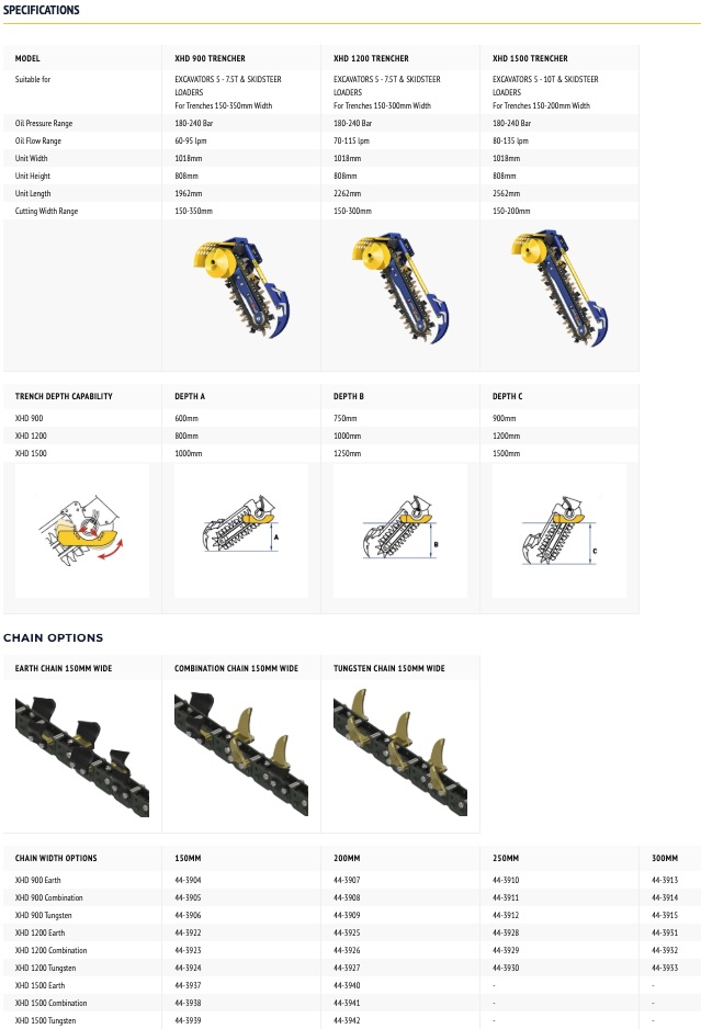Flöde: 80-115 l/min, Tryck: 180-240 bar, Fräsdjup: 1000-1500 mm, Fräsbredd: 150-200 mm, Kombikedja (Jord/Tungsten tänder)