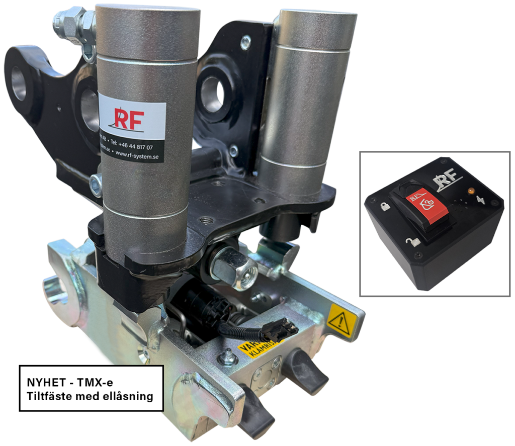 Låser/öppnar via elkabel från hytten (5 ampere) och levereras inklusive låsknapp och indikator. Tillgänglig för S30/180 och möjliggör en enkel och billig installation för maskiner upp till 2 ton. Även möjligt att komplettera äldre manuella TMX till ellåsning genom byte av underdel.